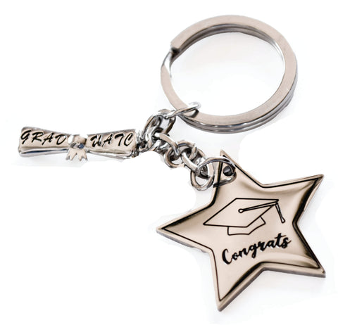 Commemorate your achievement with this premium silver keychain. Includes a silver star with Congrats engraved in black enamel and a graduation cap, a scroll charm with Graduate engraved in black enamel. All on a heavy duty keychain ring that is perfect to attach to a bag, keys, luggage, or backpack.